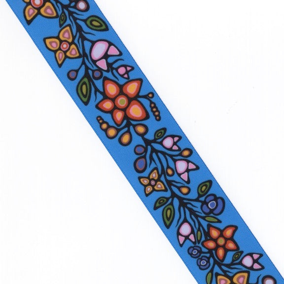 Description: Ojibway florals printed design by Jackie Traverse. This 1.5 inch satin ribbon is sold by the yard. Printed on one side. Single face, high quality ribbon. Holds up well in various applications.