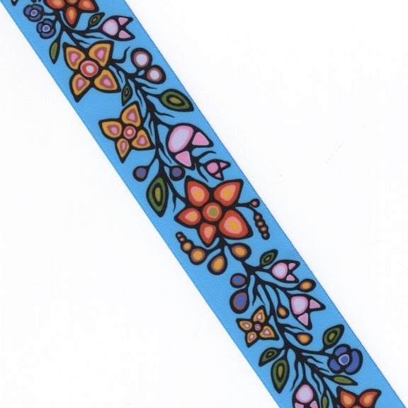 Description: Ojibway florals printed design by Jackie Traverse. This 1.5 inch satin ribbon is sold by the yard. Printed on one side. Single face, high quality ribbon. Holds up well in various applications.