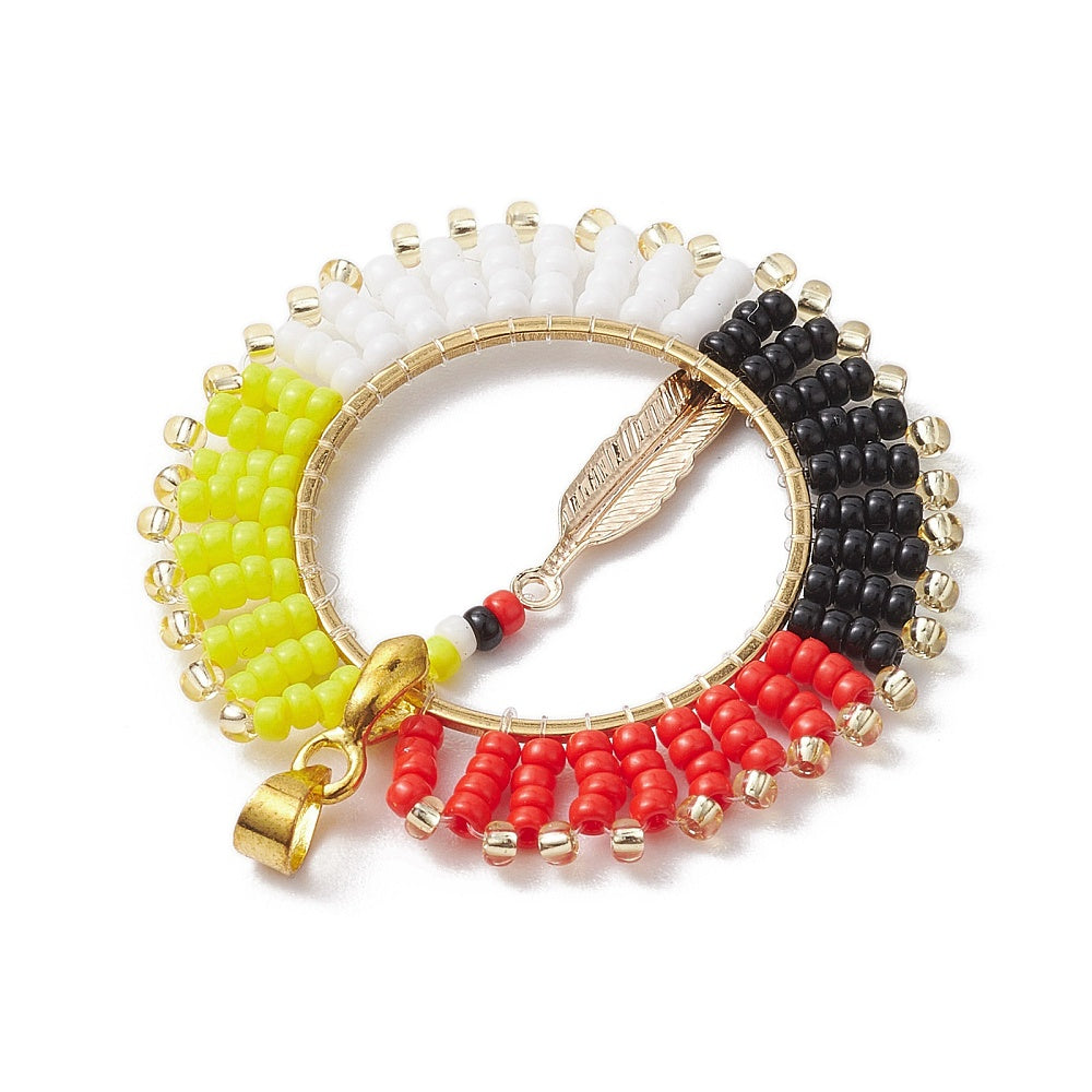 Honour balance and tradition with our Beaded Medicine Wheel Pendant, a meaningful design that represents harmony, connection, and the cycles of life. Handcrafted with colourful glass seed beads in the four sacred directions and finished with a metal feather accent, this pendant carries deep cultural symbolism. Perfect for necklaces or statement pieces, it’s a powerful pendant that brings spiritual depth and natural beauty to your jewellery creations.