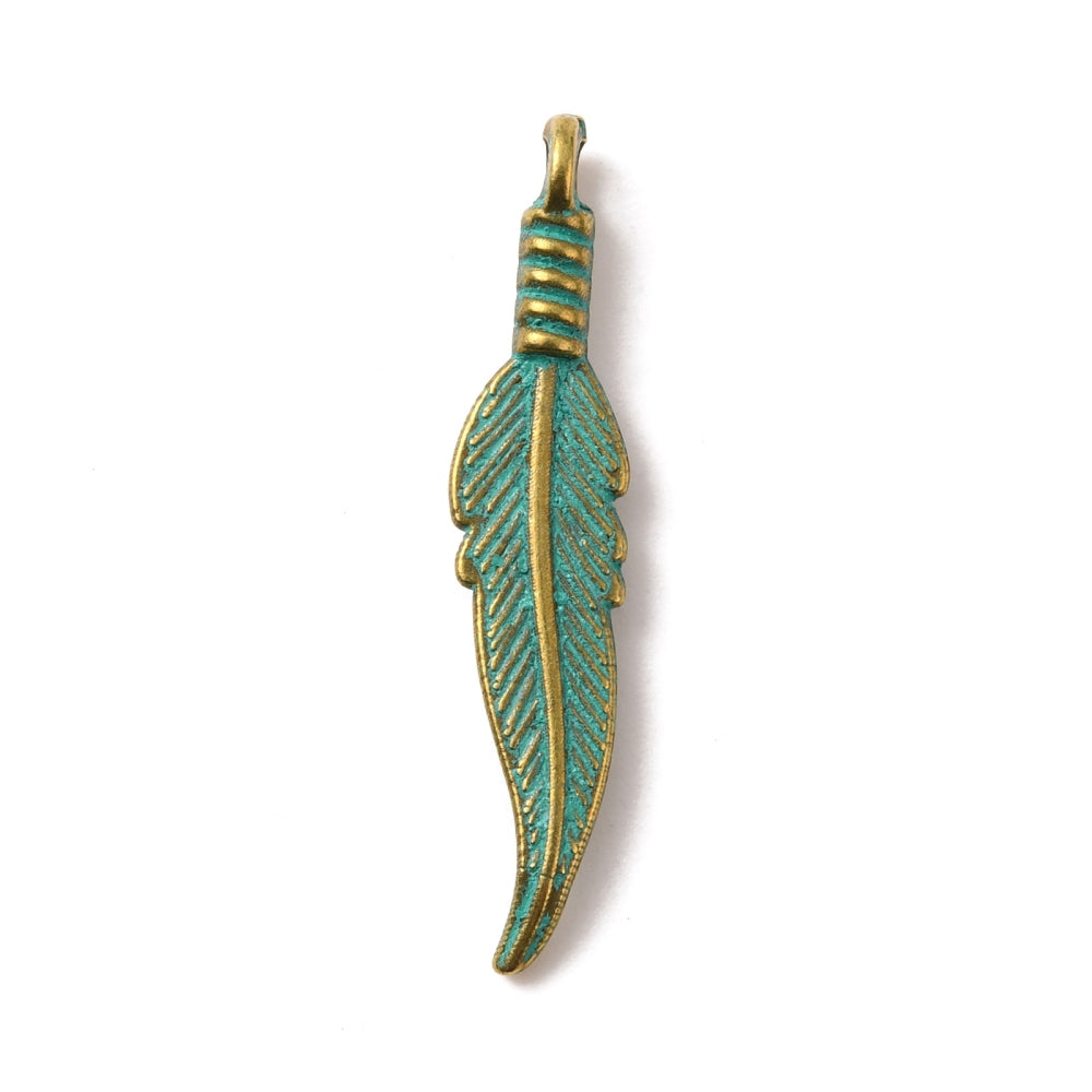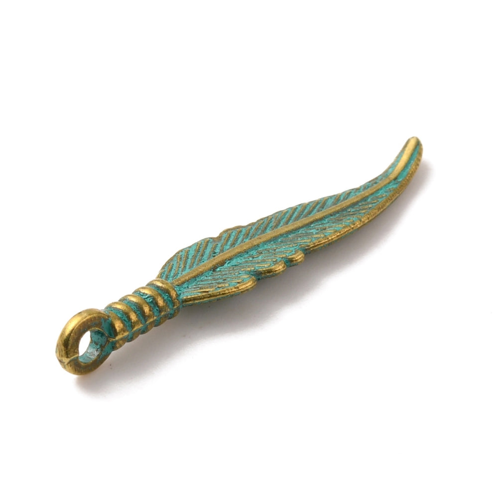 Feather Metal Pendant 32x7mm Golden Green Patina 10/pk