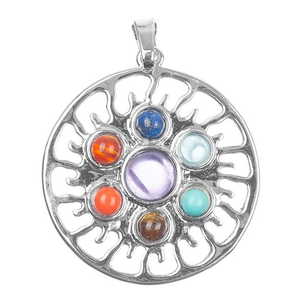 Description: Sun flat round brass metal pendant with bail, and 7 chakra 3D stone design. Measures 31mm x 35mm x 8mm. 5x8mm hole. Natural & Synthetic Gemstones. Cadmium Free, Nickel Free, Lead Free
