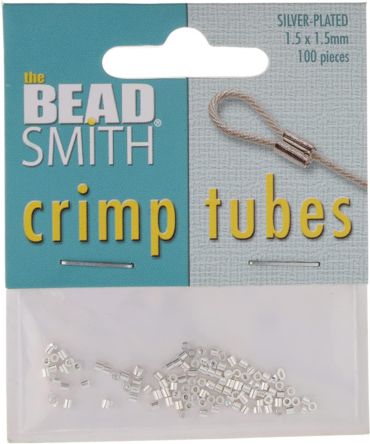 Description: Though frequently used by designers, beginners will also benefit from the simplicity of crimps. Slide the beading wire through a crimp, then loop through your clasp or jump ring. Slide it back through and use a flat nose or crimping plier to lock in place. Measures 1.5mm x 1.5mm, 0.6mm hole. Plated brass. Made in China.