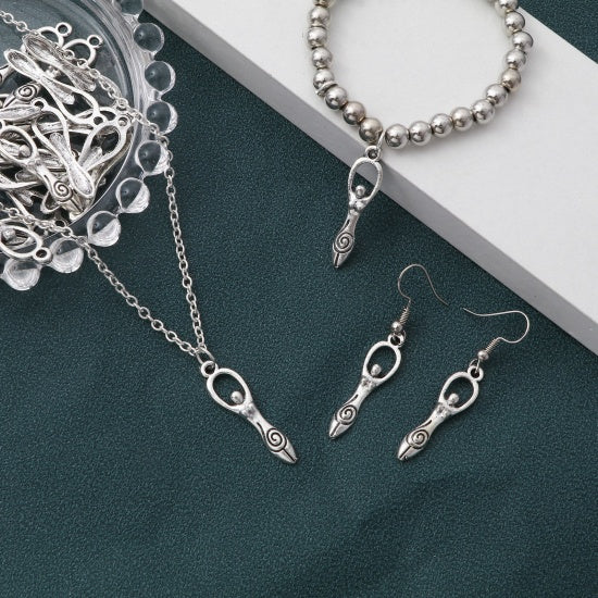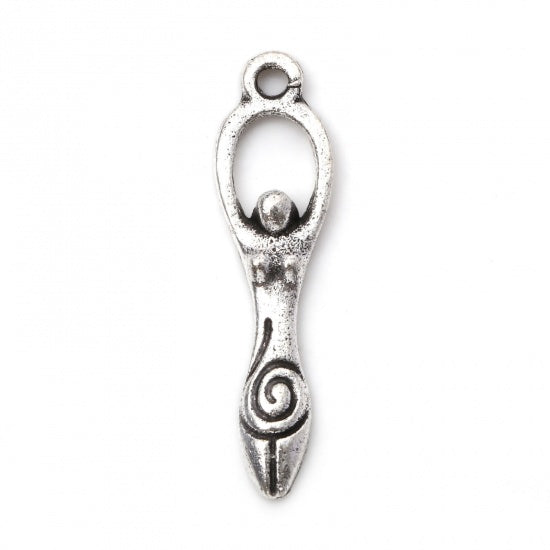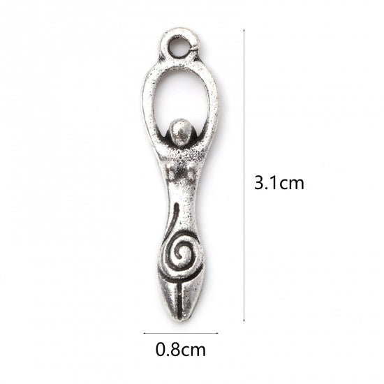 Description: Metal goddess charm. Item measures 8mm wide x 31mm long. Zinc based alloy. Lead free, Nickel free.