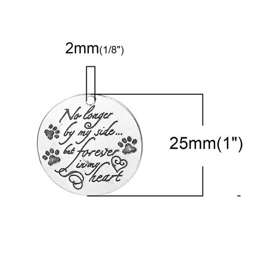 Honour a beloved companion with this round memorial pendant engraved “No longer by my side… but forever in my heart,” accented with tiny paw prints and a heart. A tender keepsake for everyday remembrance, it shines as a necklace focal, layers beautifully with initials or birthstones, and also works as a meaningful keychain or zipper pull. It adds comforting beauty and enduring meaning to your jewellery creations.