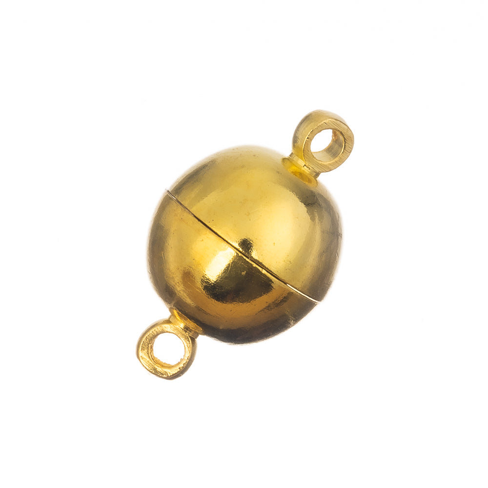 Description: Round magnetic clasp with loops. Measures 10mm wide x 16mm long, 1.2mm hole. Metal plated brass.