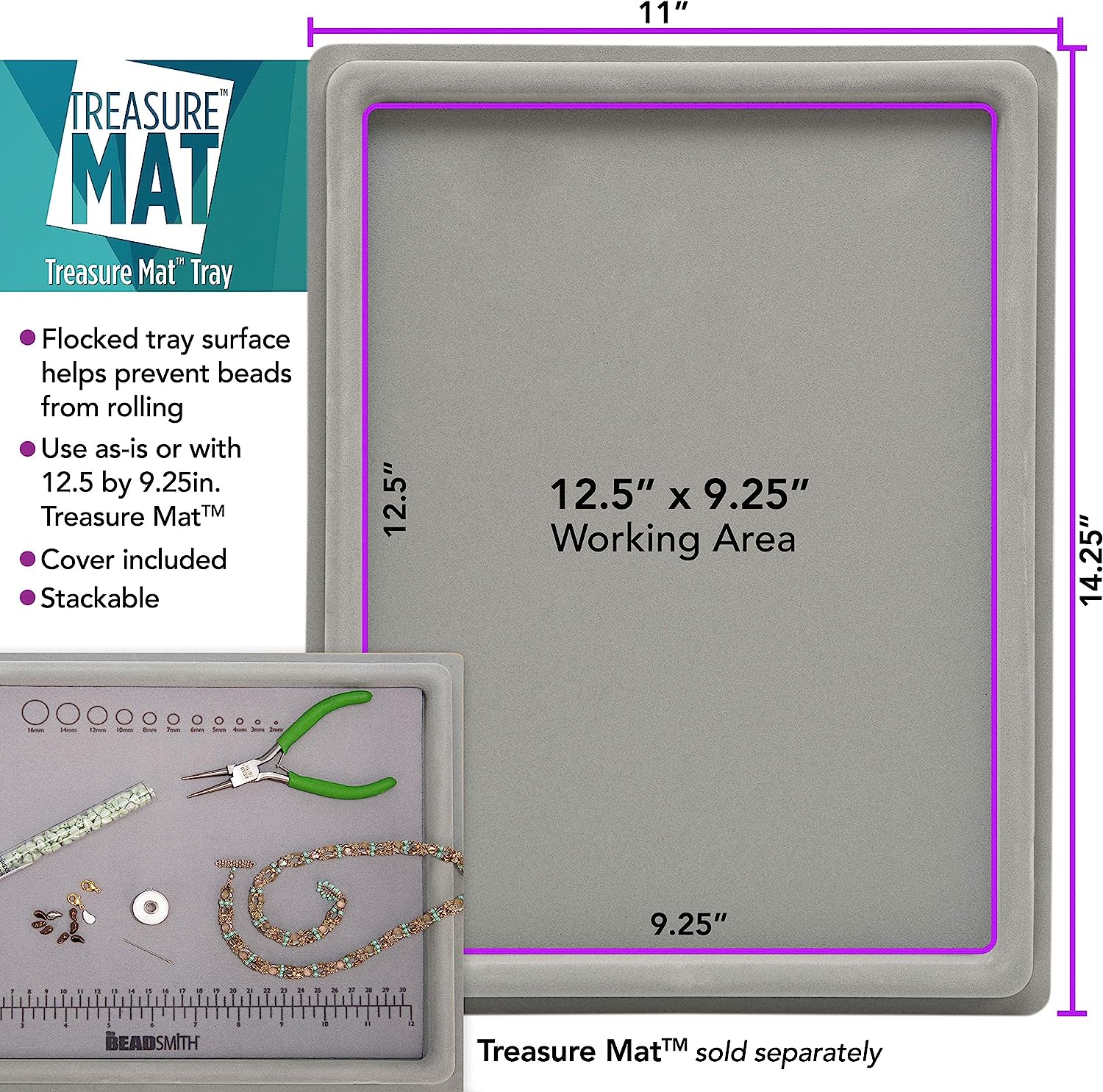 Description: Flocked tray surface helps prevent beads from rolling; Cover makes tray easily transportable; Stackable for convenient storage; Use as-is or with the 12.5 x 9.25 in. Bead Mat (sold separately).