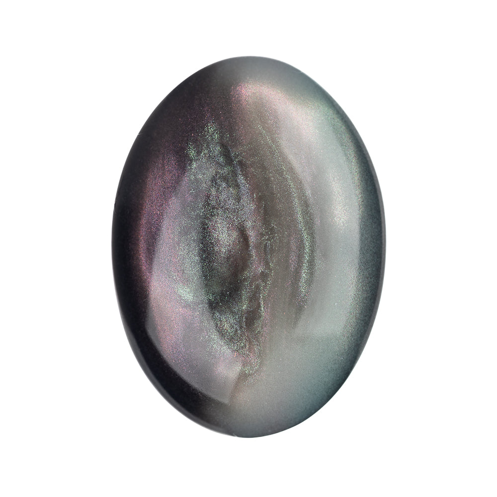 Description: Imitation shell resin oval flat back cabochon. Black base with abalone shell colours coming through. Measures 13mm wide x 18mm long x 4mm thick.