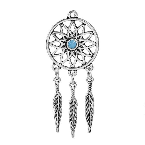 Description: Dream catcher flat round alloy metal pendant with turquoise resin cabochon and feathers. Measures 64mm long x 26mm wide, hole: 2.1mm.