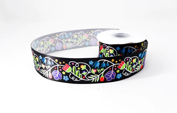 Description: This design is by Metis artist Victoria Scattergood and is representative of traditional Metis beadwork on black velvet. The black background makes the colorful beadwork pop. This 2 inch satin ribbon is sold by the 20 yard roll. Printed on one side. Single face, high quality ribbon. Holds up well in various applications.