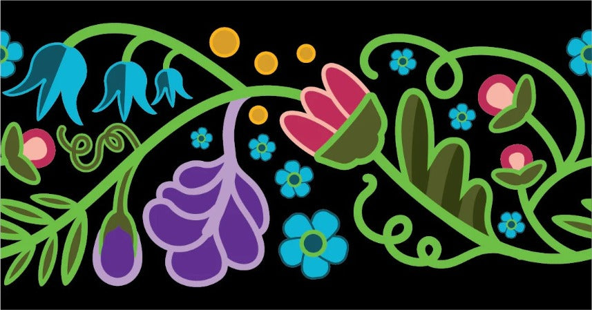 Description: This design is by Metis artist Victoria Scattergood and is representative of traditional Metis beadwork on black velvet. The black background makes the colorful beadwork pop. This 2 inch satin ribbon is sold by the yard from a 20 yard roll. Printed on one side. Single face, high quality ribbon. Holds up well in various applications.