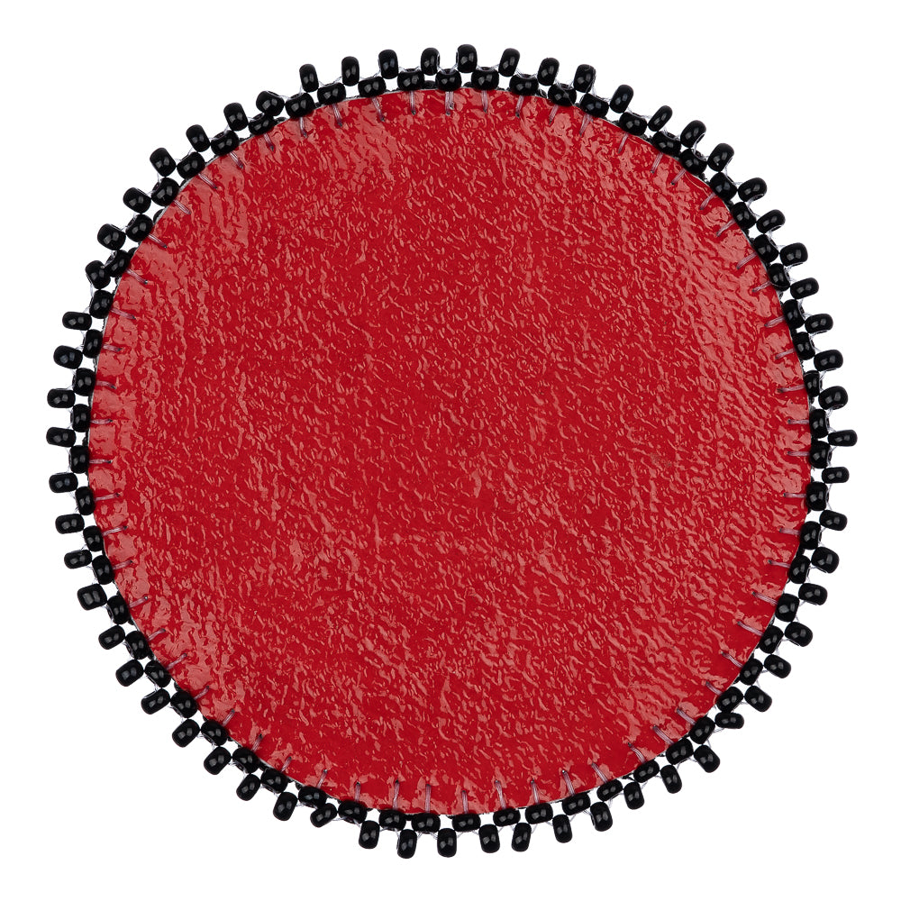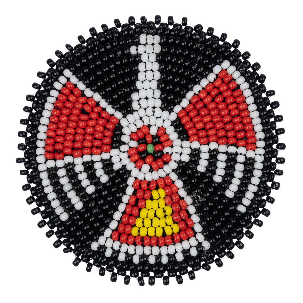 Description: Beaded rosette with leather backing. Ideal for use on native crafts such as mitts, moccasins, pouch or purse, garments, regalia, hair ties or barettes, and bolo ties. Imported.