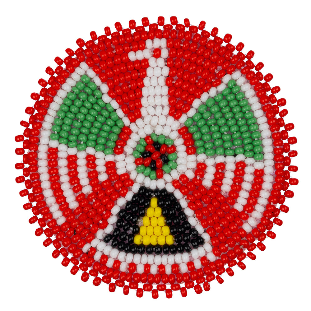 Description: Beaded rosette with leather backing. Ideal for use on native crafts such as mitts, moccasins, pouch or purse, garments, regalia, hair ties or barettes, and bolo ties. Imported.