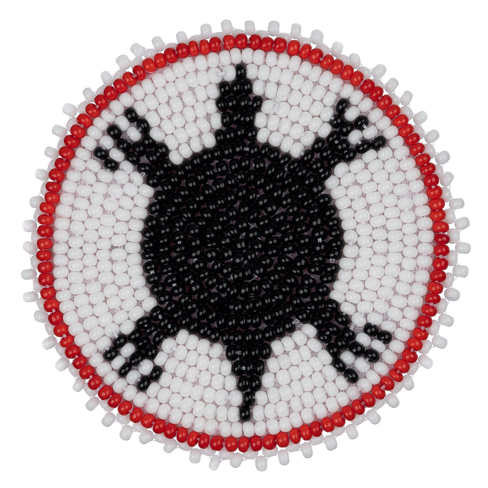 Description: Beaded rosette with leather backing. Ideal for use on native crafts such as mitts, moccasins, pouch or purse, garments, regalia, hair ties or barettes, and bolo ties. Imported.