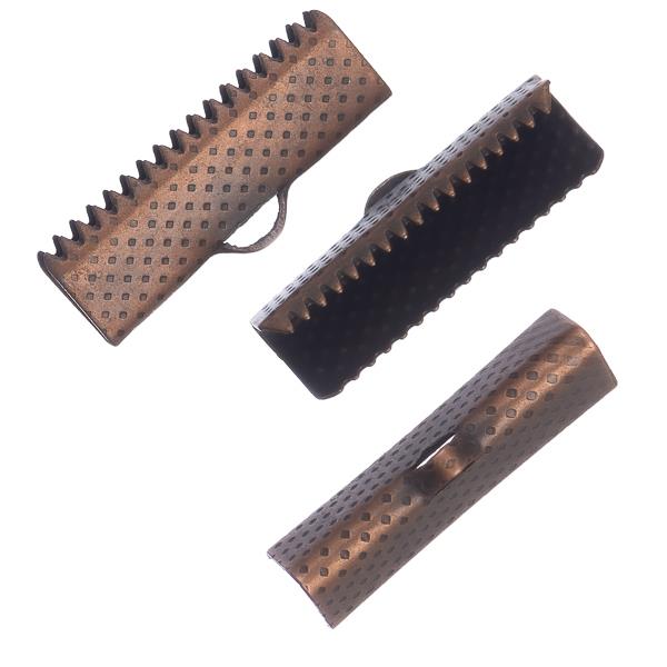 Description: Hide your unfinished ribbon or leather ends with these crimps. Simply press together with your flat nose pliers to securely hold your material. Attach a jump ring to connect it to a clasp, key chain or other findings. Iron based metal, measures about 20mm long, 8mm wide, 5mm thick, hole: 2mm