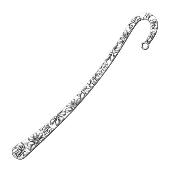 Description: Flowers and Butterflies antique silver zinc alloy bookmark with a loop on the end where you add beads, charms, ribbon... to decorate it. Place the bookmark inside the book and drape the decorative end on the front of the book. Measures 124mm long, 3mm thick with 2.5mm hole. Lead free, cadmium free.