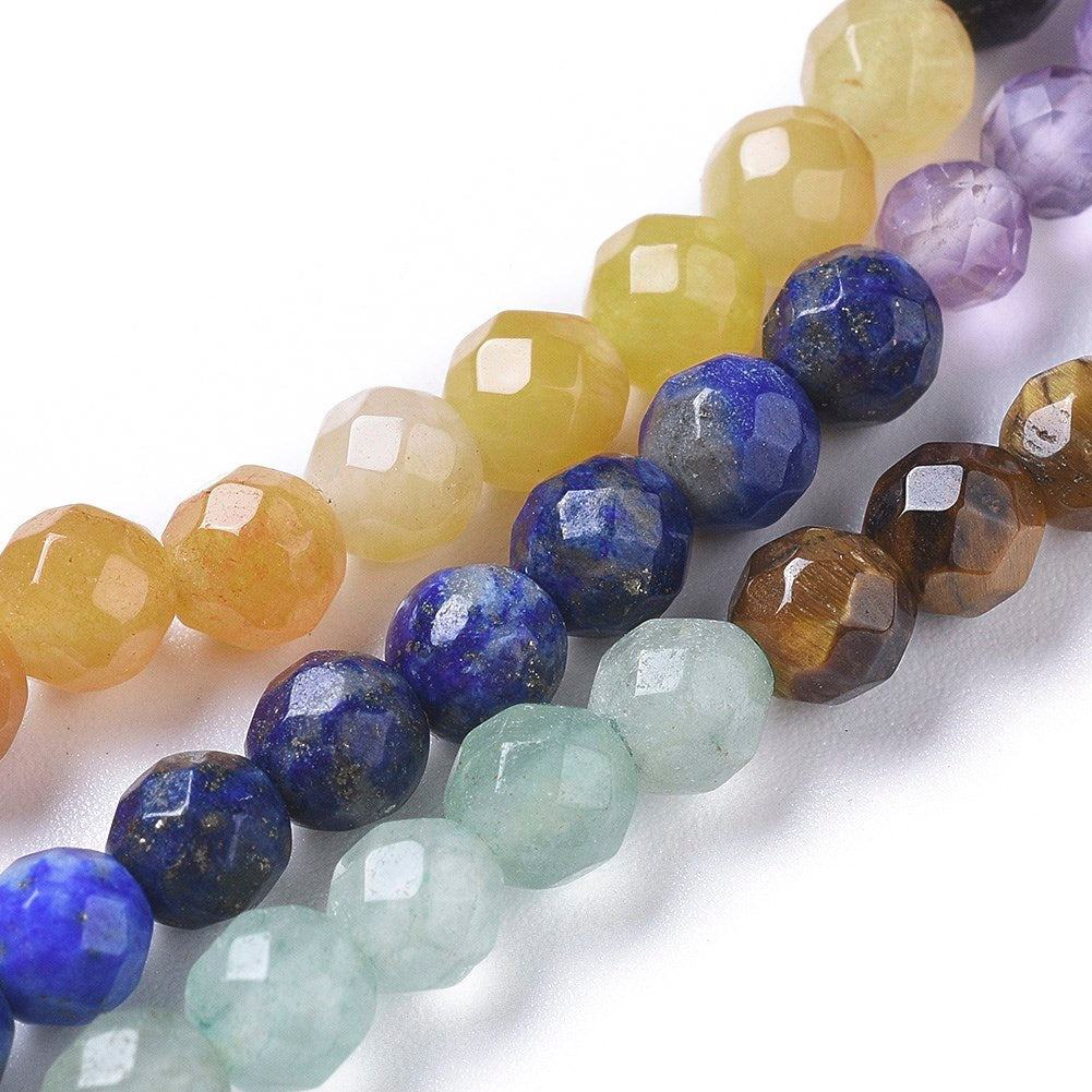 This stunning set combines seven natural gemstones, each linked to one of the body’s energy centres: Red Rainbow Jasper (Root), Yellow Aventurine (Sacral), Tiger Eye (Solar Plexus), Green Aventurine (Heart), Blue Spot Stone (Throat), Lapis Lazuli (Third Eye), and Amethyst (Crown). The faceted finish enhances their sparkle, creating jewellery that is not only colourful and eye-catching but also symbolic of balance, alignment, and positive energy. Ideal for chakra bracelets, malas, or meaningful designs that connect beauty with intention. Slight variations in colour, size, and markings are to be expected, adding to their one-of-a-kind appeal.
