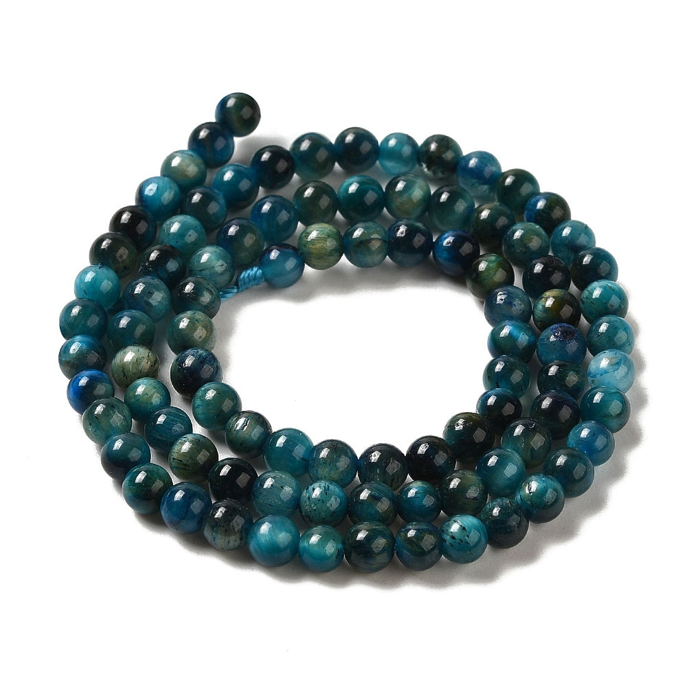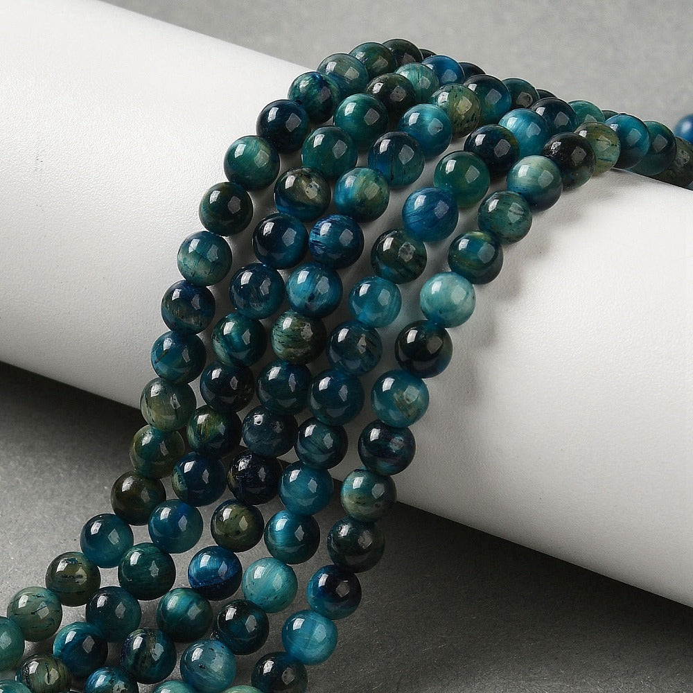 These polished beads display deep shades of teal and midnight blue, with the signature chatoyancy (“cat’s-eye effect”) that makes Tiger Eye shimmer as the light moves across its surface. Enhanced through dyeing to achieve their bold colour, these beads still carry Tiger Eye’s traditional association with courage, focus, and protection. Their rich tones and glowing effect make them an excellent choice for jewellery that feels both striking and contemporary. Slight variations in colour, size, and markings are to be expected, adding to their one-of-a-kind appeal.