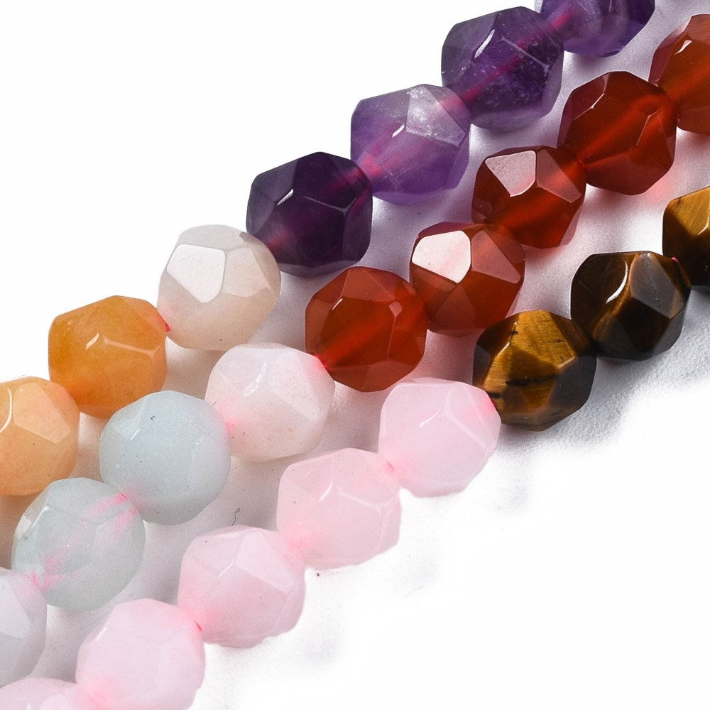 This striking set combines seven natural gemstones, each linked to a chakra: Tiger Eye (Solar Plexus), Rose Quartz (Heart), Amethyst (Crown), Topaz Jade (Sacral), Red Agate (Root), Amazonite (Throat), and Sodalite (Third Eye). The unique star cut gives each bead extra sparkle and texture, catching the light in a way that brings out their natural beauty. Together, these stones symbolize balance, harmony, and positive energy, making them ideal for creating chakra jewellery, malas, or statement pieces with both meaning and brilliance. Slight variations in colour, size, and markings are to be expected, adding to their one-of-a-kind appeal.