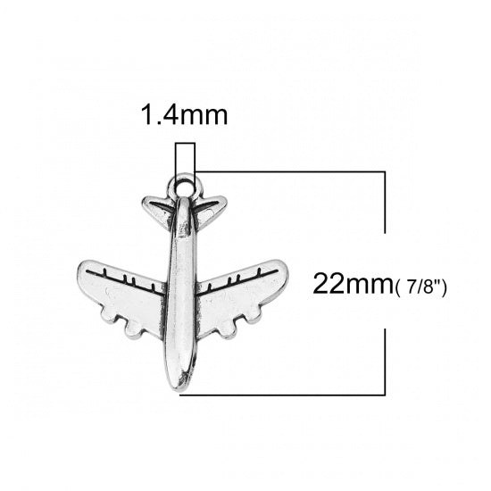 Description: Antique silver airplane metal charm. Item measures 20mm wide x 22mm long x 2.4mm thick, 1.4mm hole. Zinc alloy. Lead free, nickel free.