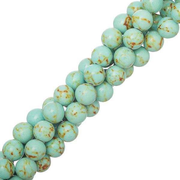 These round beads feature a smooth polish with bright turquoise-green tones and striking reddish-brown veining, enhanced through dyeing for vivid colour and contrast. Their bold appearance makes them perfect for creating statement pieces or adding a pop of colour to jewellery designs. While man-made, they echo the classic beauty of natural turquoise and bring a lively, eye-catching touch to any project. Slight variations in colour, size, and markings are to be expected, adding to their one-of-a-kind appeal.