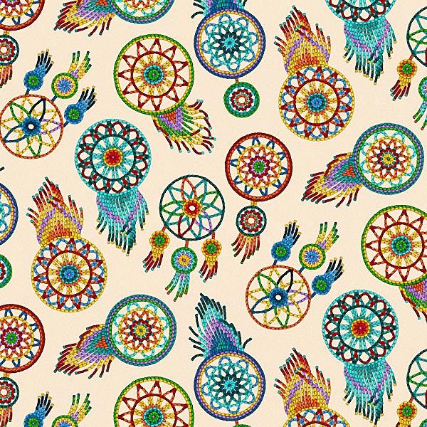 This cotton fabric features radiant dream catcher motifs rendered in a dazzling beaded style, evoking protection, harmony, and cultural storytelling in every detail. Its lightweight versatility makes it perfect for ribbon skirts, regalia accents, star quilts, and powwow accessories, while also lending itself beautifully to tote bags, table runners, and wall hangings that carry meaning and tradition. Sold by the half yard; multiple quantities are sold in one continuous cut. Pre-wash and dry before sewing to prevent shrinkage. Machine wash cold with like colours; tumble dry low; warm iron.
