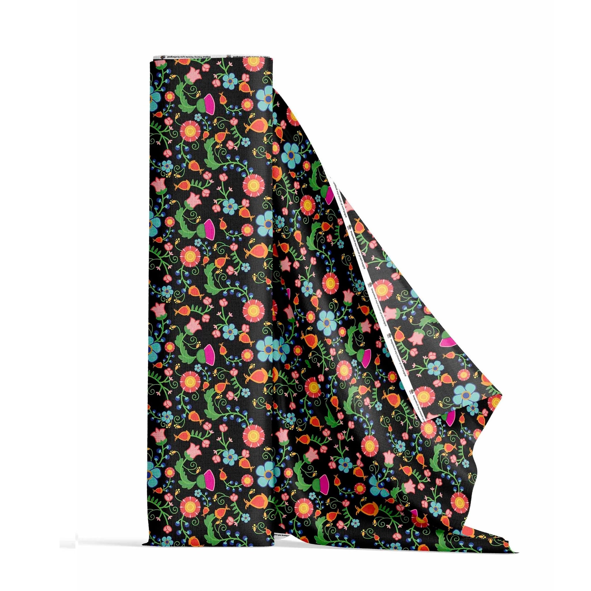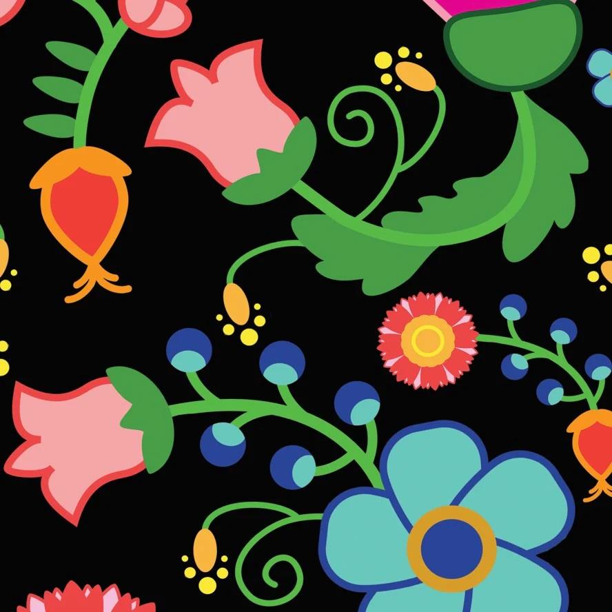 This cotton fabric features playful floral vines dotted with berries and whimsical accents, blending lively garden energy with cultural artistry for a pattern that feels cheerful and modern. Lightweight yet versatile, it’s perfect for ribbon skirts, regalia accents, powwow accessories, and star quilts, while also lending itself beautifully to tote bags, table runners, and wall hangings. Sold by the half yard; multiple quantities are sold in one continuous cut. Pre-wash and dry before sewing to prevent shrinkage. Machine wash cold with like colours; tumble dry low; warm iron.