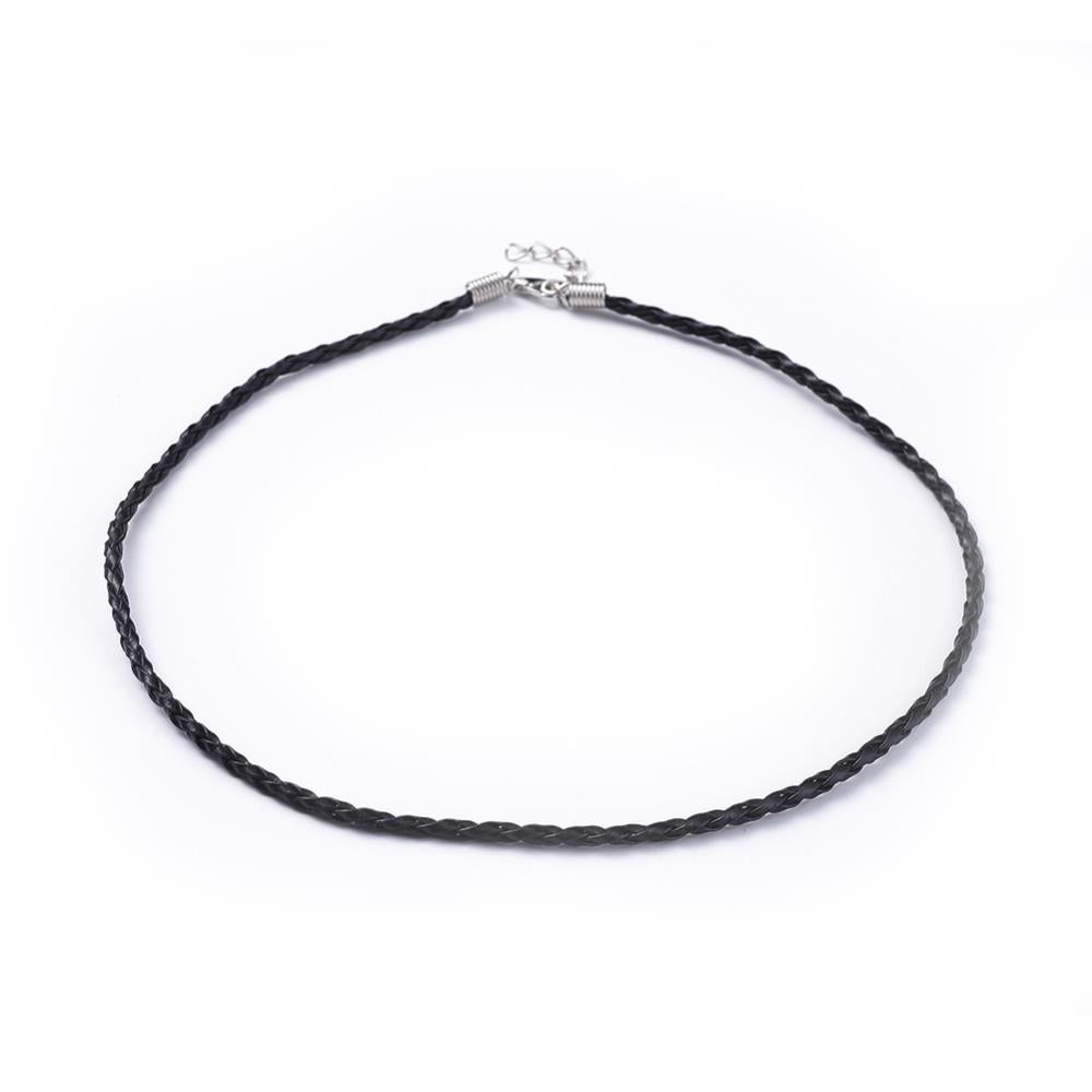 Description: Just add a pendant or charm to this ready made necklace. It's as easy as 1,2,3. Imitation leather braided cord with nickel colour lobster clasp. Measures 3mm thick x 17 inch long.