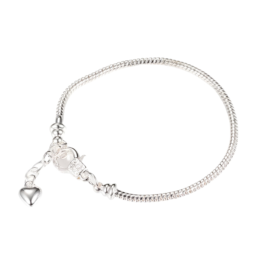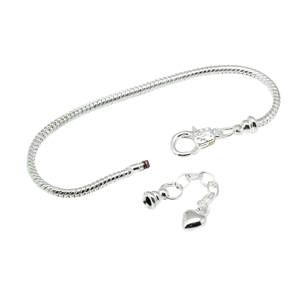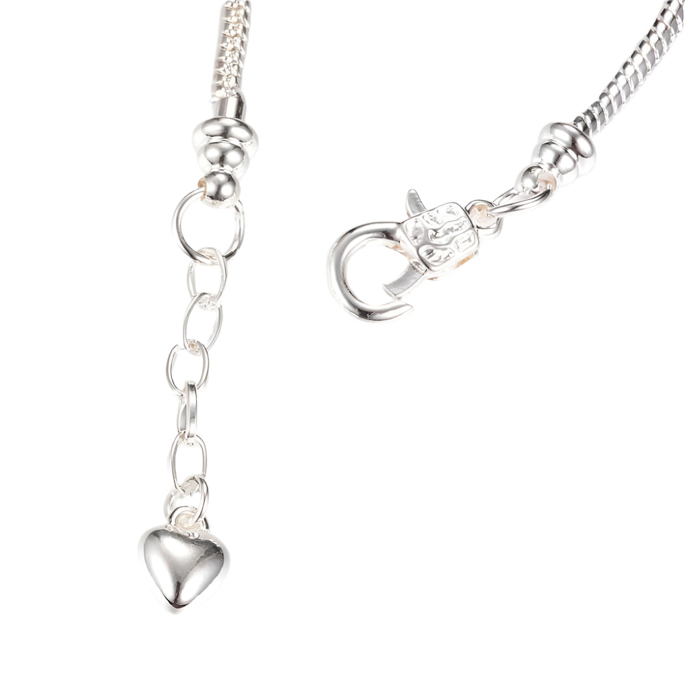 Description: Create elegant, customizable jewelry with this brass Pandora style bracelet, featuring a sleek silver finish, a sturdy iron extender chain for an adjustable fit, and a heart charm. Measuring 7.5 inches (19cm) in length (excluding the 3.5m extender) and 2.5mm thick, this bracelet is perfect for adding charms, beads, or pendants to craft unique, personalized accessories.