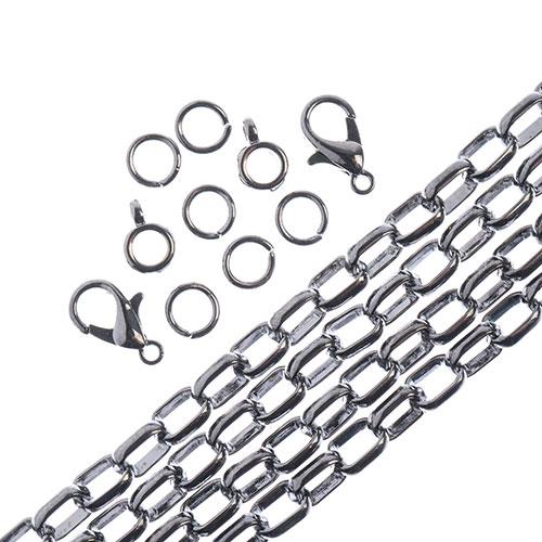 Description: Chain and matching findings. Each set includes one 36 inch chain, 6 jump rings, 2 bails, and 2 lobster clasps. Metal: Iron.