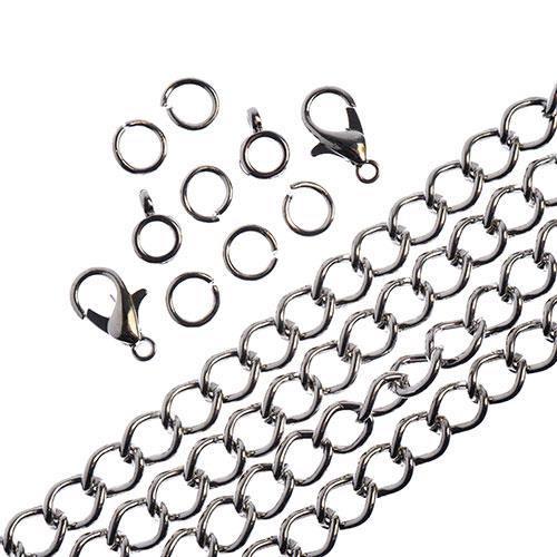 Description: Chain and matching findings. Each set includes one 36 inch chain, 6 jump rings, 2 bails, and 2 lobster clasps. Metal: Iron.