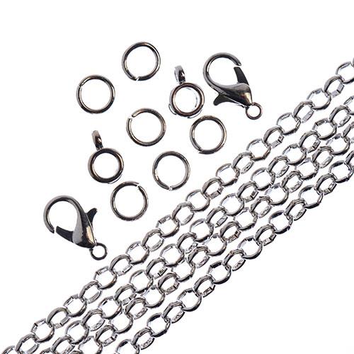 Description: Chain and matching findings. Each set includes one 36 inch chain, 6 jump rings, 2 bails, and 2 lobster clasps. Metal: Iron.