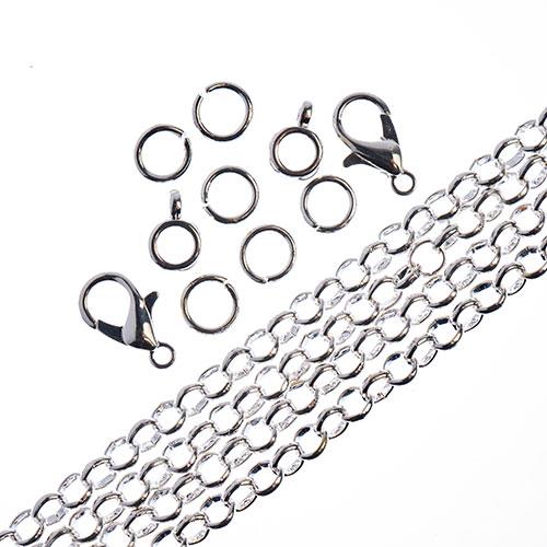 Description: Chain and matching findings. Each set includes one 36 inch chain, 6 jump rings, 2 bails, and 2 lobster clasps. Metal: Iron.
