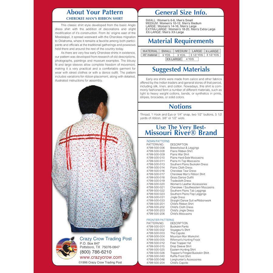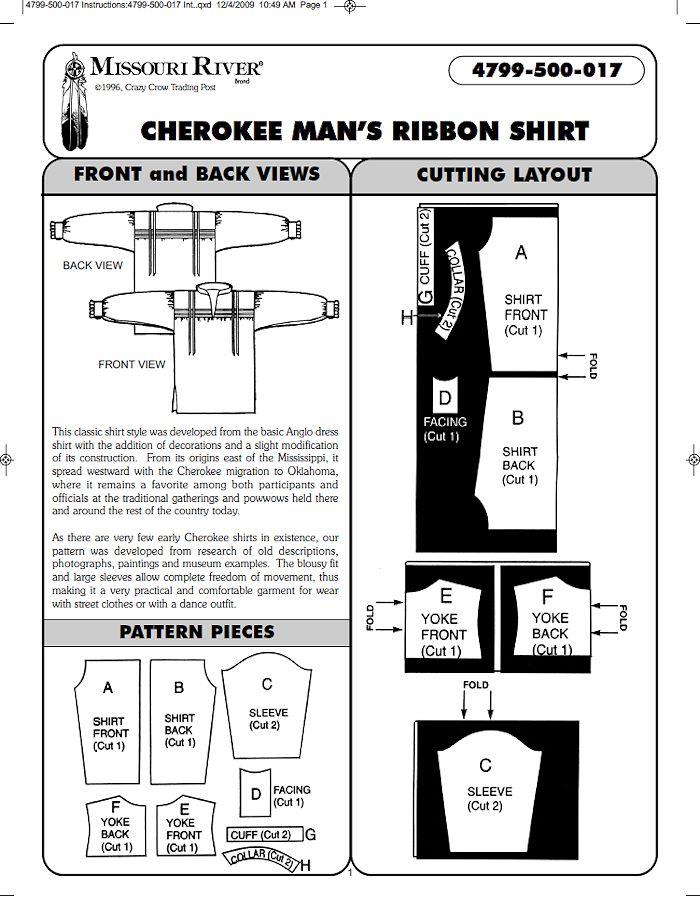 Description: This early style pattern was developed from information gathered in museums and old photographs of Cherokee people. Produces an authentically detailed shirt in the correct tribal style. Modeled by Philip Cunningham - Comanche-Sioux.