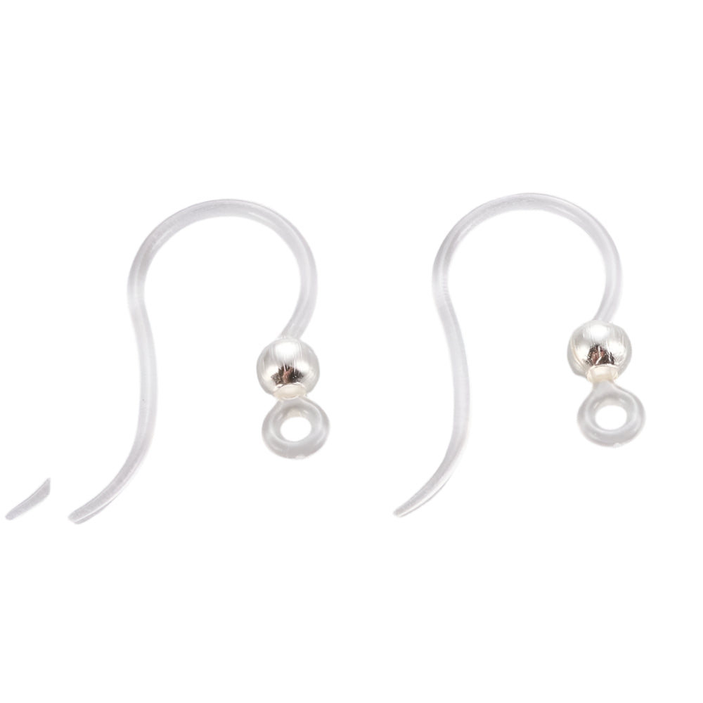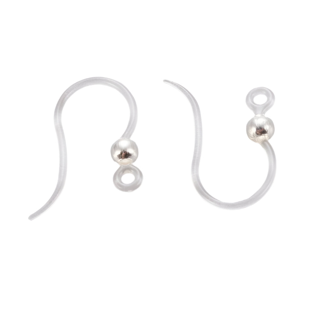 Description: Hypoallergenic clear eco plastic earring hooks with 304 stainless steel bead. Ideal for people with metal allergies. Measures 16mm x 8mm x 0.7mm, Hole: 1.2mm, Pin: 0.5mm