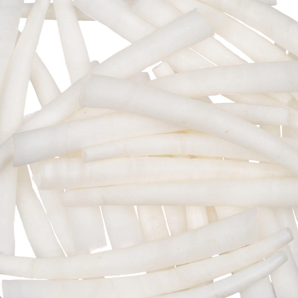 These Smooth Dentalium Shells range from approximately 1" to 2" in length and are prized for their sleek, tapered shape and clean surface. Naturally harvested, each shell carries slight variations in size, color, and condition, adding to their organic beauty. While some minor breakage may occur due to their delicate nature, they remain ideal for use in traditional crafts, jewelry, regalia, and decorative projects.