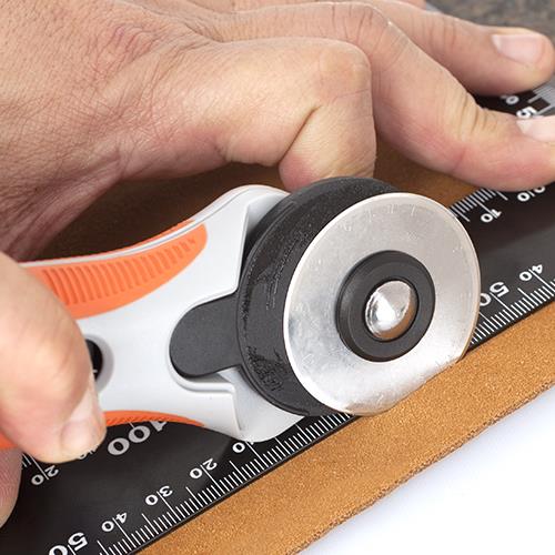 Description: Contoured handle design with soft cushion for comfortable holding. Safety guard on blade section. The convenient locking device, at the finger tip, is easy to manage. The rotary cutter is well suited to use on leather, paper and fabric.