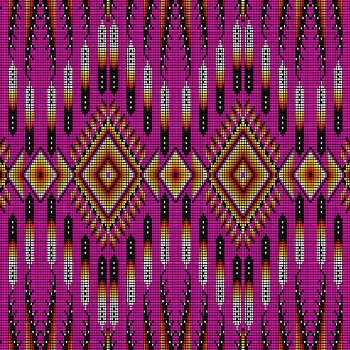 This cotton fabric features beadwork-inspired diamond medallions with cascading feather motifs, creating flame-like movement that evokes ceremony, strength, and cultural storytelling in a design that feels dynamic and powerful. Lightweight yet versatile, it is perfect for ribbon skirts, regalia accents, powwow accessories, and star quilts, while also lending itself beautifully to tote bags, table runners, and wall hangings that honor tradition. Sold by the half yard; multiple quantities are sold in one continuous cut. Pre-wash and dry before sewing to prevent shrinkage. Machine wash cold with like colours; tumble dry low; warm iron.