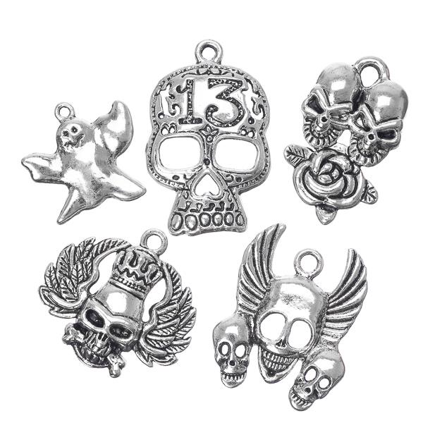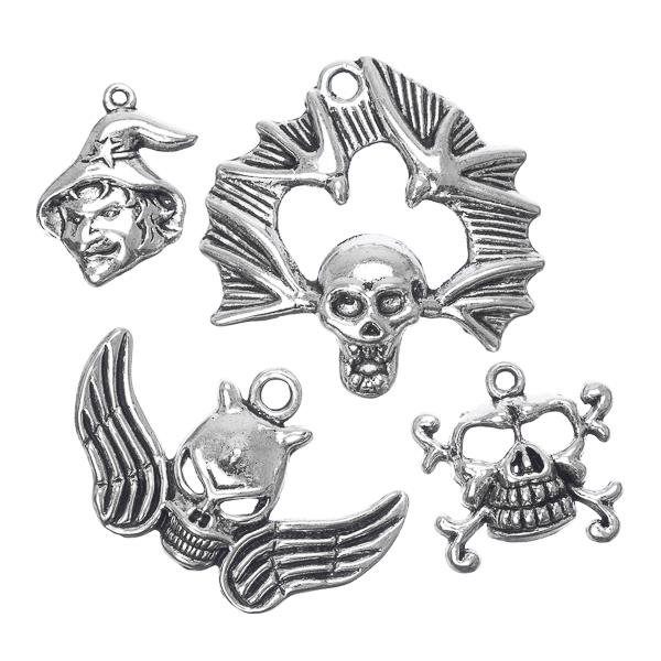 Description: Metal Halloween theme metal charms. 10 assorted styles. Perfect for Halloween. Items measure 21mm wide x 25mm long - 39mm x 38mm x 2mm thick x 3.2mm hole. Lead free & Nickel free zinc based alloy.