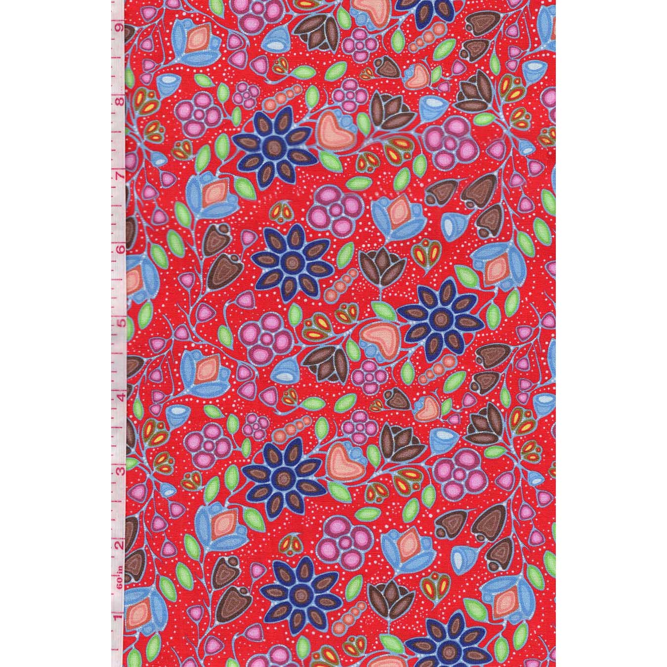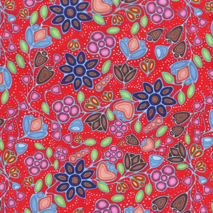 This cotton fabric features blossoms and butterfly spirits from “Heal,” where flowers bloom from tears to honor MMIWG2S—an allover pattern of remembrance and renewal. Lightweight yet versatile, it’s ideal for ribbon skirts, regalia accents, star quilts, shawls, tote bags, and wall hangings. Sold by the half yard; multiple quantities are sold in one continuous cut. Pre-wash and dry before sewing to prevent shrinkage. Machine wash cold with like colours; tumble dry low; warm iron.