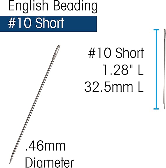 A shorter version of the classic size #10 needle, this needle is expertly crafted for precision beadwork in tight spaces. Measuring approximately 32 mm (1.280 inches) in length and 0.46 mm in thickness, it’s slim enough for intricate stitching yet compact for detailed work.