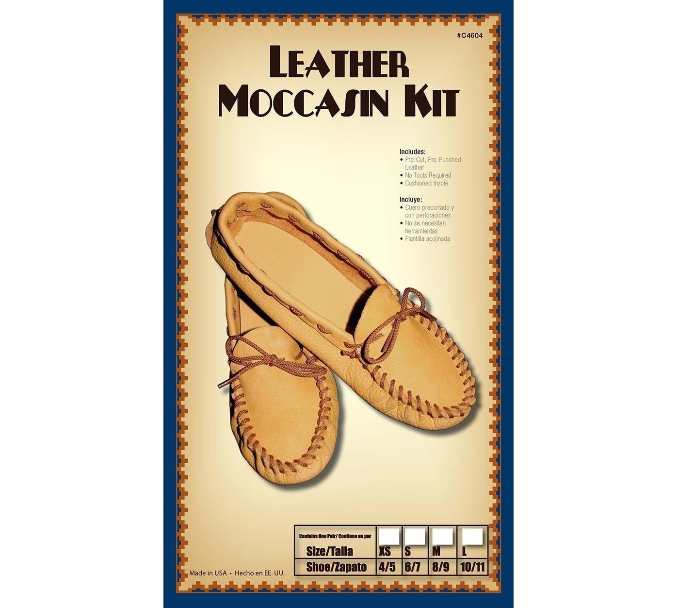 Description: You may not want to wear your regular shoes again, once you slip into these soft, scout style mocs. Made from durable golden tan Deertan cowhide, these comfortable mocs will conform to the shape of your feet with wear. Kit includes pre-cut & pre-punched leather, cushiony foam insoles, lace and step-by-step assembly instructions. Ladies order shoe size and men order one size larger. Made in USA.