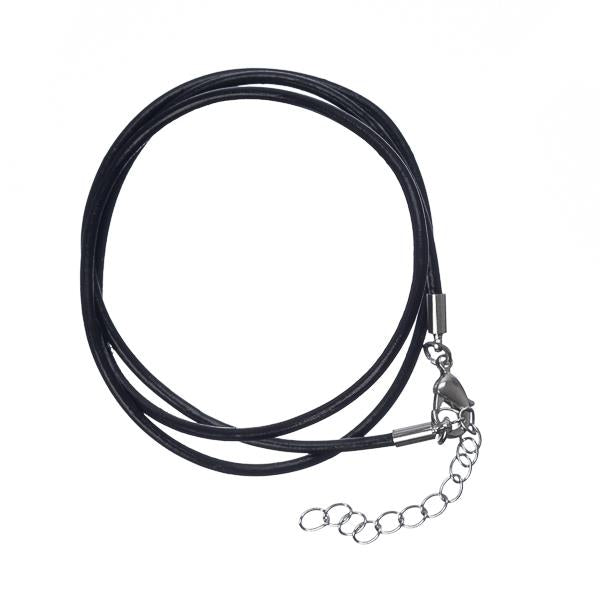 Description: Just add a pendant or charm to this ready made necklace. It's as easy as 1,2,3. Leather necklace with nickel colour zinc alloy lobster clasp and brass findings. Measures 18 inch long x 2mm thick.