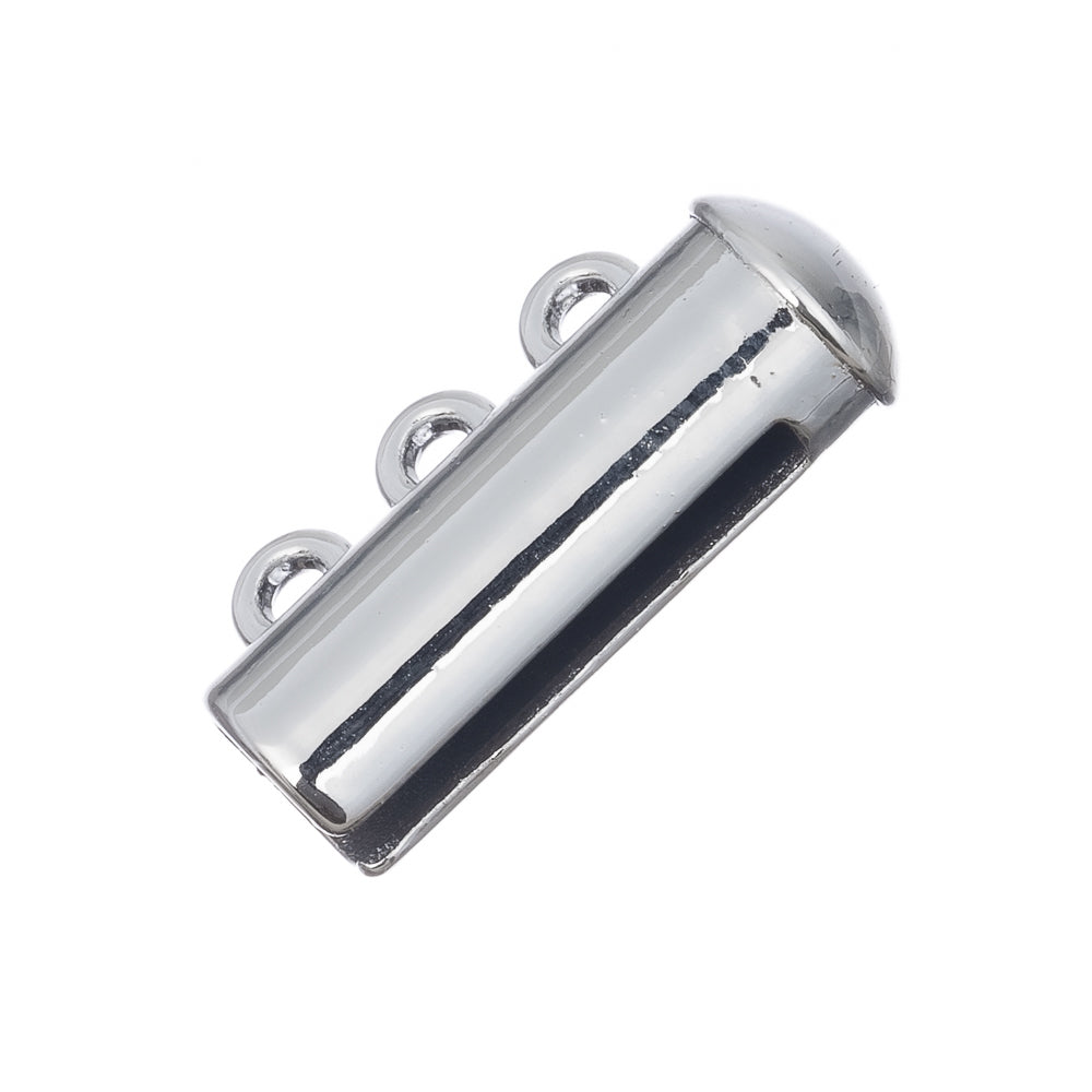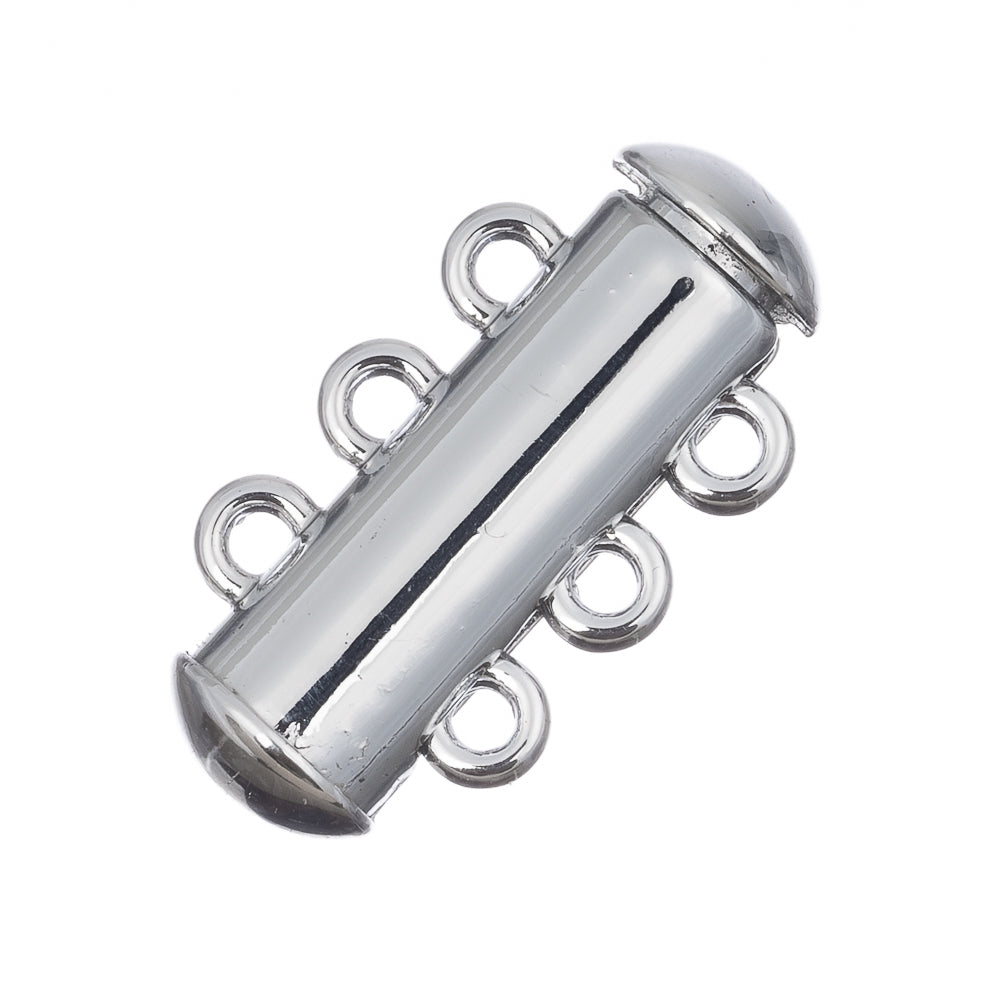 Description: This magnetic slide clasp features 3 small holes on either side, prefect for your multi strand designs. The magnets at the end of the clasp hold it closed and make it easy to open and close. Plated brass. Measures 20mm long x 10mm wide x 6mm thick, 1.4mm holes.