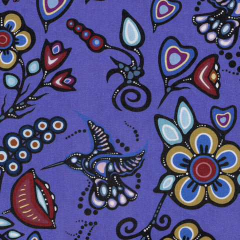 This cotton fabric features a hummingbird in flight among Ojibway florals with dotted woodland details, celebrating joy, vitality, and cultural storytelling in a design full of movement. Lightweight yet versatile, it is perfect for ribbon skirts, regalia accents, powwow accessories, and star quilts, while also lending itself beautifully to tote bags, table runners, and wall hangings. Sold by the half yard; multiple quantities are sold in one continuous cut. Pre-wash and dry before sewing to prevent shrinkage. Machine wash cold with like colours; tumble dry low; warm iron.