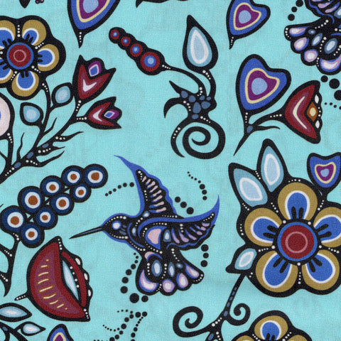 This cotton fabric features a hummingbird in flight among Ojibway florals with dotted woodland details, celebrating joy, vitality, and cultural storytelling in a design full of movement. Lightweight yet versatile, it is perfect for ribbon skirts, regalia accents, powwow accessories, and star quilts, while also lending itself beautifully to tote bags, table runners, and wall hangings. Sold by the half yard; multiple quantities are sold in one continuous cut. Pre-wash and dry before sewing to prevent shrinkage. Machine wash cold with like colours; tumble dry low; warm iron.