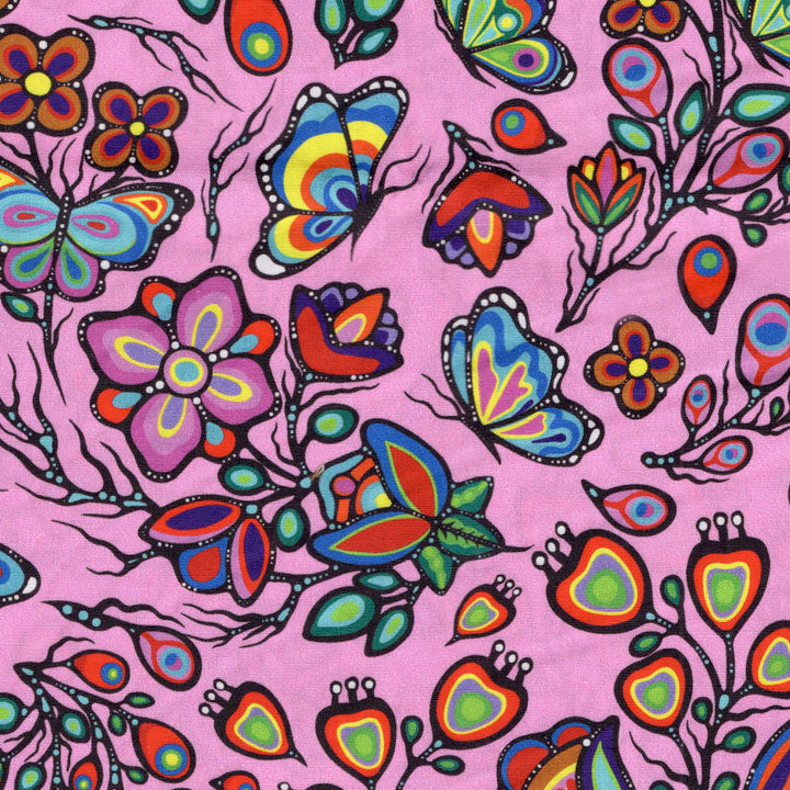 This cotton fabric features Memengwa (butterflies) dancing among Ojibway florals, symbolizing transformation, renewal, and cultural storytelling in a pattern that feels graceful and uplifting. Lightweight yet versatile, it is perfect for ribbon skirts, regalia accents, powwow accessories, and star quilts, while also lending itself beautifully to tote bags, table runners, and wall hangings. Sold by the half yard; multiple quantities are sold in one continuous cut. Pre-wash and dry before sewing to prevent shrinkage. Machine wash cold with like colours; tumble dry low; warm iron.
