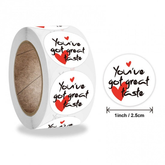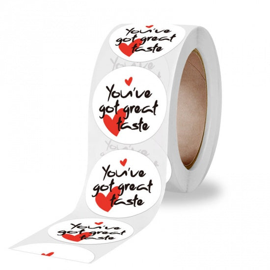 Description: Packaging Label, 1 inch stickers, "You've Got Great Taste" with Hearts. Adds a special touch to customer purchases and gifts.