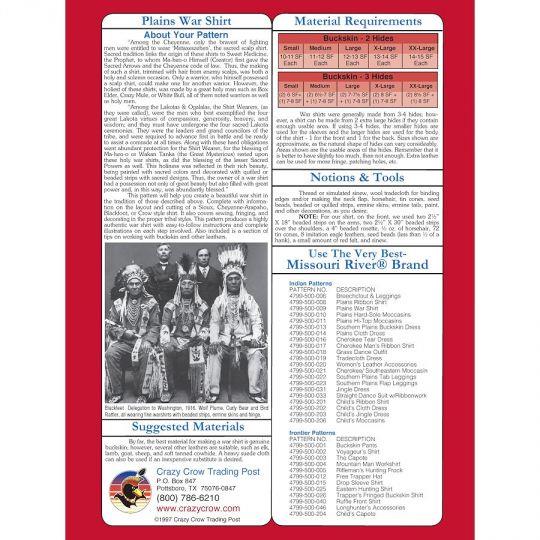 Description: Developed from museum examples, this pattern will make a classic Northern Plains buckskin war shirt. Sioux, Cheyenne, Crow, Arapaho and Blackfoot style shirts are depicted, with hints on placement of various decorations and beadwork. Modeled by Donald Cole Echota - Cherokee.