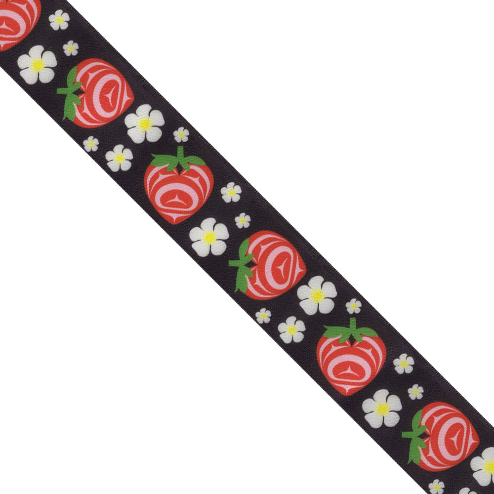 Bring a vibrant, cultural touch to your projects with the Strawberry Ribbon by Yasakw Designs (Shelly Samuels). This striking printed ribbon features stylized strawberries and blossoms in soft pink, white, and yellow, set against a rich background. Inspired by Samuels' Haida and Kwakwakaʼwakw roots, the design honors her heritage with bold formline shapes and playful, natural motifs. Perfect for gift wrapping, accessories, crafts, or decorative trims, this ribbon adds meaningful beauty and a burst of colour to any creation.