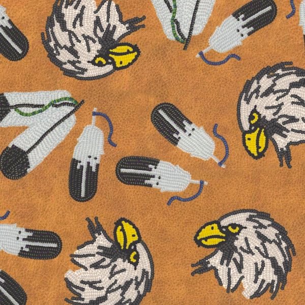 This cotton fabric features beadwork-style eagles and feathers in a scattered layout, honoring vision, protection, and cultural storytelling in a design that feels bold and meaningful. Lightweight yet versatile, it is perfect for ribbon skirts, regalia accents, powwow accessories, and star quilts, while also lending itself beautifully to tote bags, table runners, and wall hangings. Sold by the half yard; multiple quantities are sold in one continuous cut. Pre-wash and dry before sewing to prevent shrinkage. Machine wash cold with like colours; tumble dry low; warm iron.